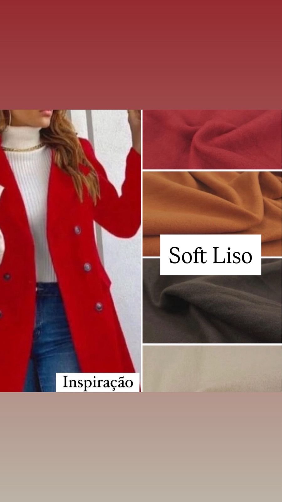 O Soft Liso é um tecido macio, quente e confortável, ideal para quem busca toque agradável e aconchego em suas peças. Com caimento suave e textura uniforme, proporciona conforto e praticidade no dia a dia.